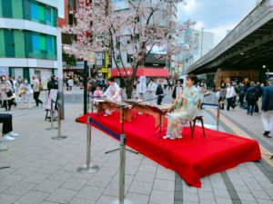 当日は桜の下に演台を設置して、来街者の皆様に琴と尺八の生演奏を楽しんでいただきました。